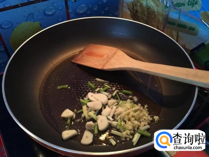 然后我们就用葱姜蒜来炝锅爆香,如果有香味后就可以把这些材料放进锅里面炒了,因为过了水所以很容易熟。