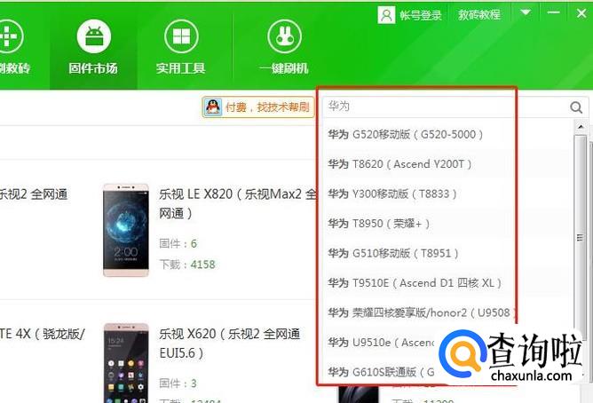 然后我们在“固件市场”栏目下利用搜索框快速查找我们的手机型号。