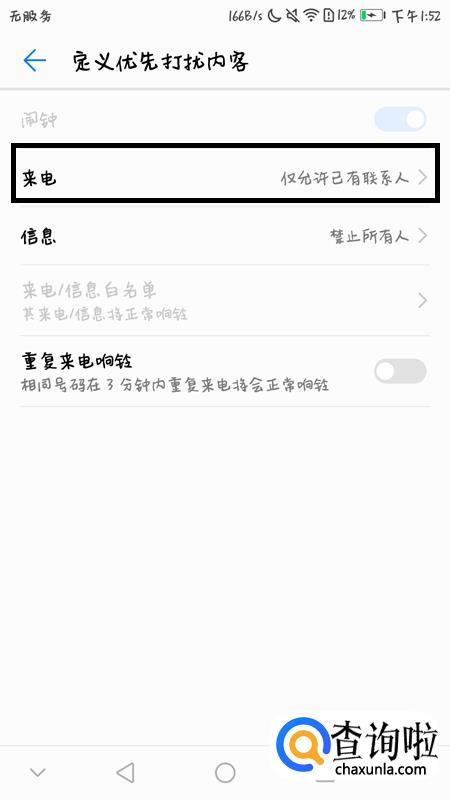 进入防打扰模式以后,我们可以看到设置的是禁止所有人来电。这样就出现了所有人都打不进来电话的情况。