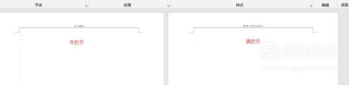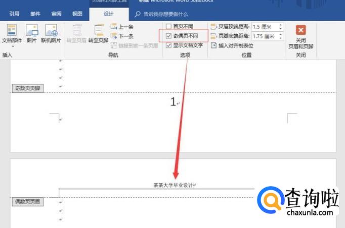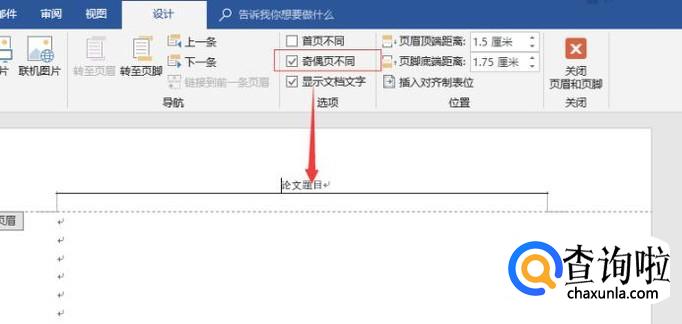 首先编辑奇数页,在“奇偶页不同”前打对勾,并输入论文题目。