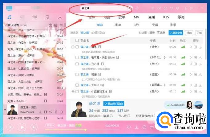 在输入框中输入【薛之谦】,然后点击【搜索】图标,在下方可以显示薛之谦的全部歌曲,如下图所示: