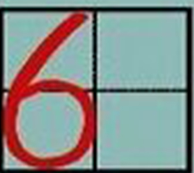 “6”从上线偏右一点起向下方画一个孤形,碰左线、底线,向上碰右线画成一个小圆,小圆上面超过中线。