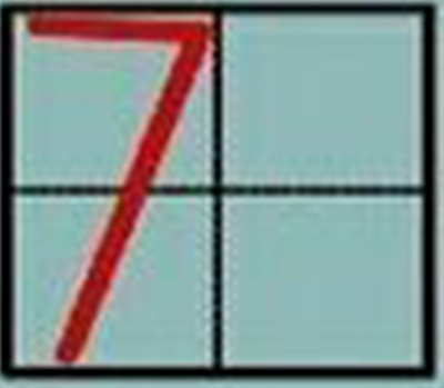 “4”从上线的中间起笔,向左斜线到下格,碰左线再折右碰线。第二笔从右上角附近下去,到下面的当中碰线。