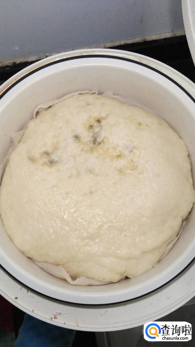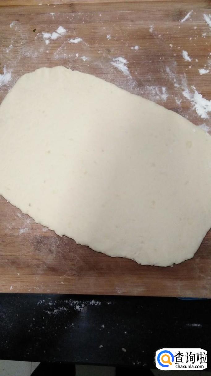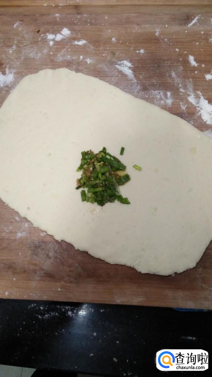 将发酵好的面团,用手揉一下,然后擀成薄片儿,然后将葱油放在面片上面摊开。