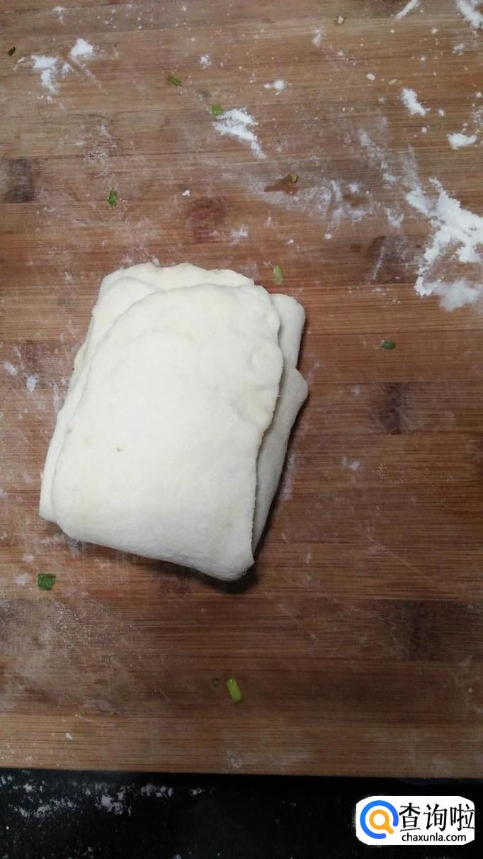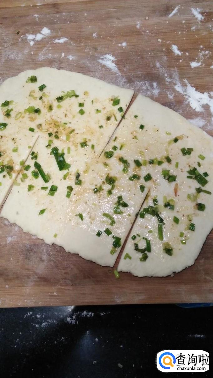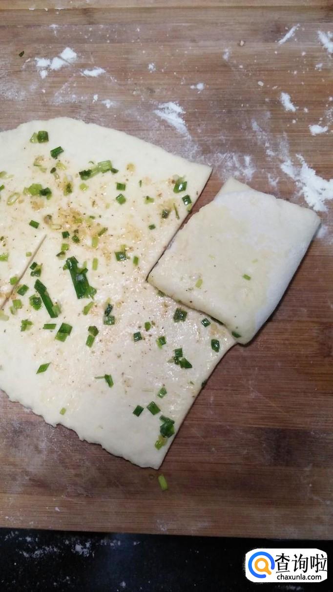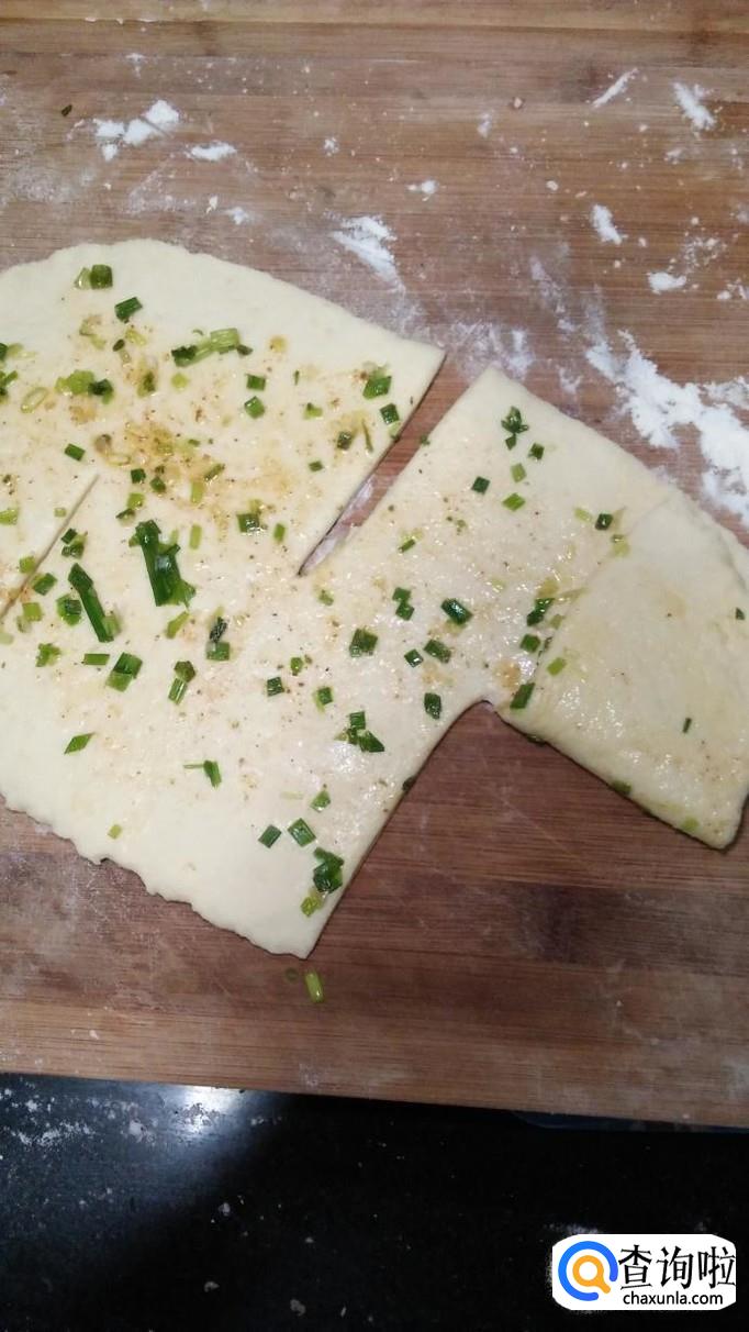 葱油摊均匀之后,用刀划三道,不要切断,按照图中所示的方法叠加起来。