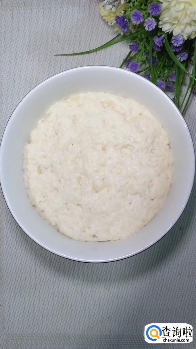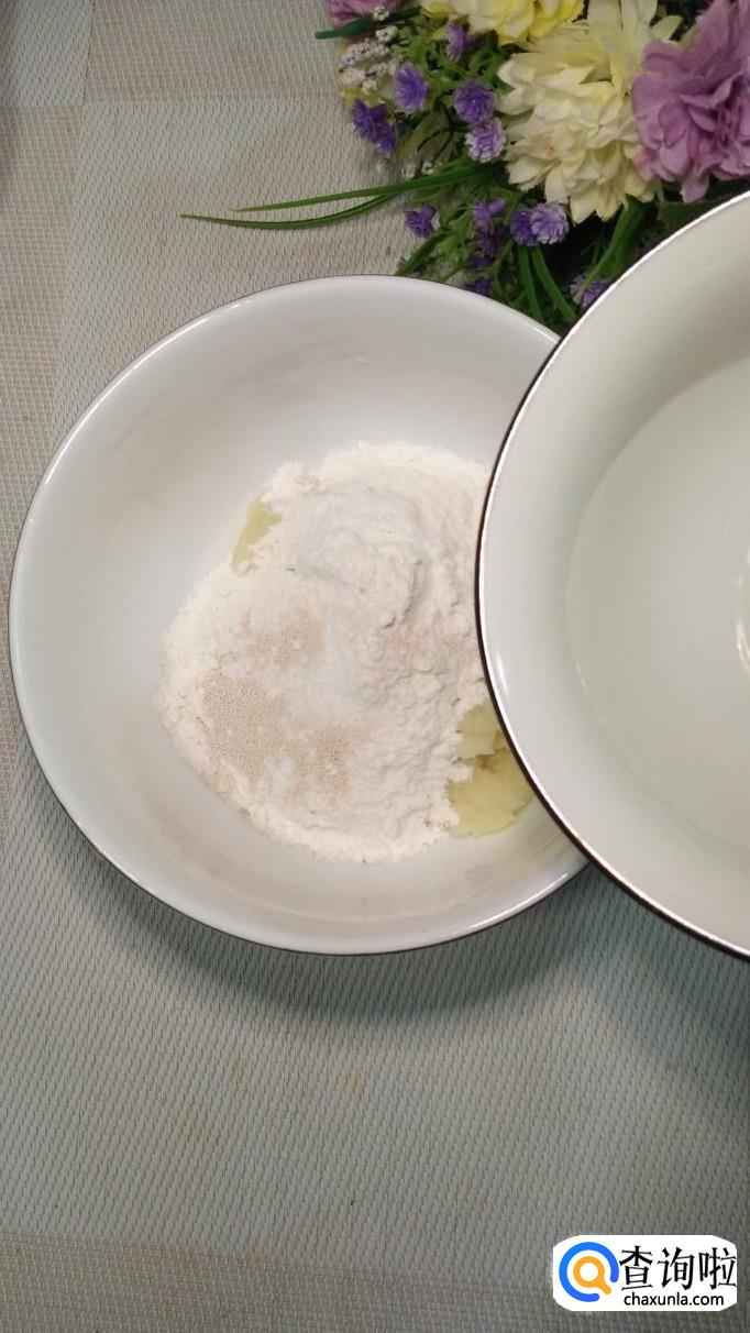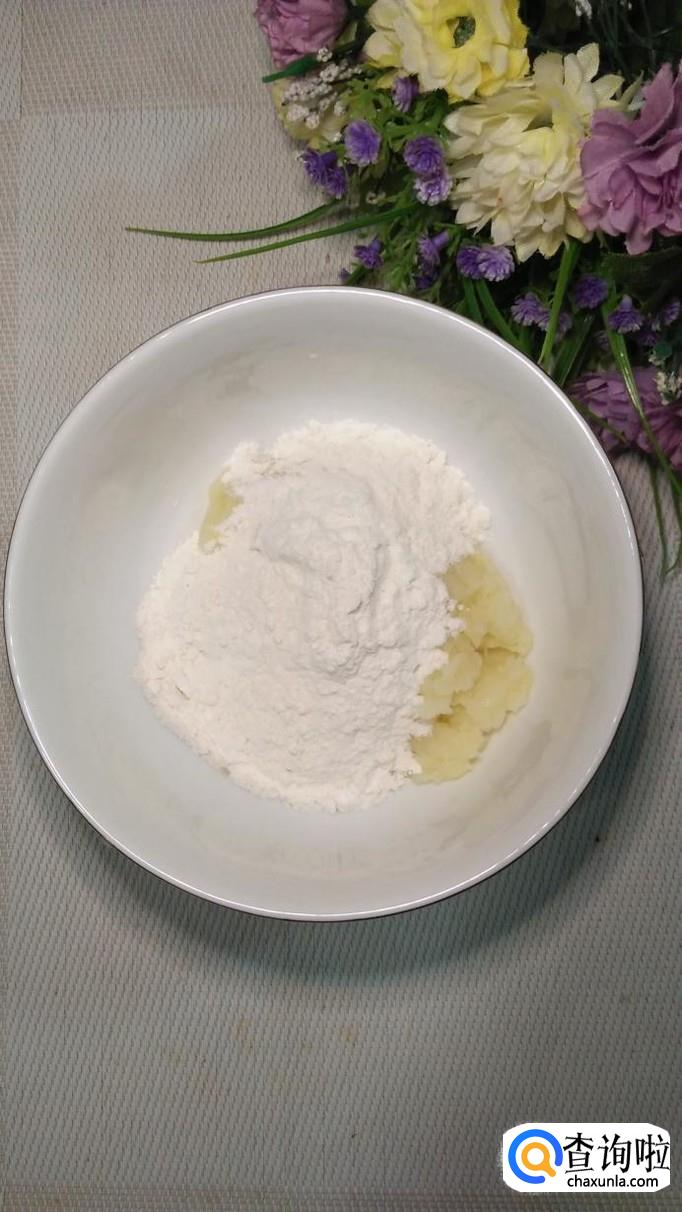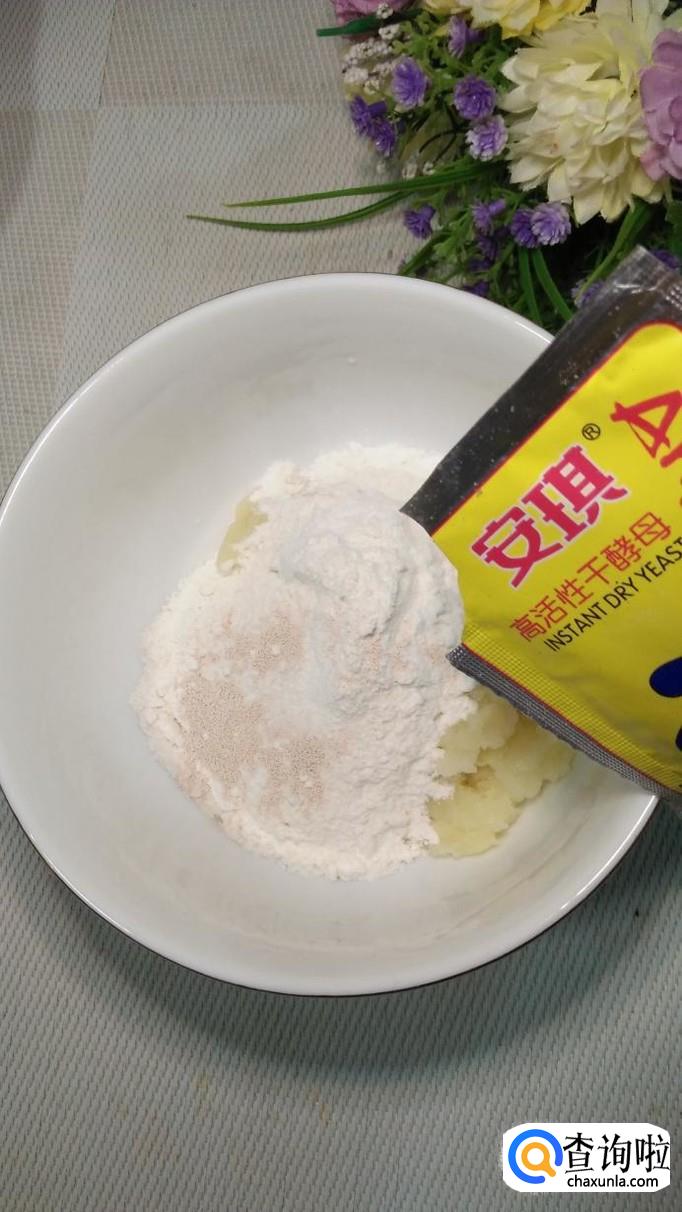 将蒸好的土豆用小勺压成泥,加入适量面粉,再加入适量的酵母粉,酵母粉的量可以稍微多一些,这样可以加快发酵的速度。