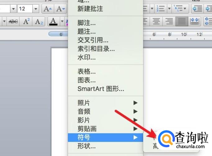 在插入菜单里,点击‘符号’--‘高级符号’。