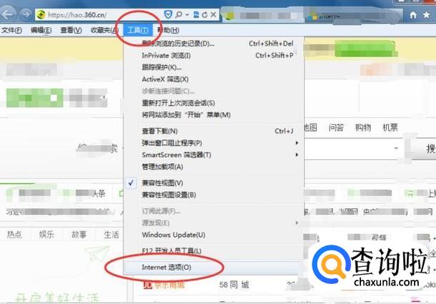 打开IE浏览器,然后点击【工具】,在弹出的下拉菜单中选择【Internet选项】,如下图所示: