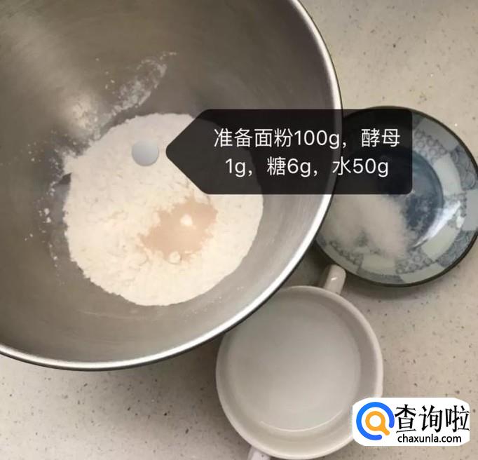 首先准备好100克的面粉、酵母1克、糖6克和水50克,如下图所示。