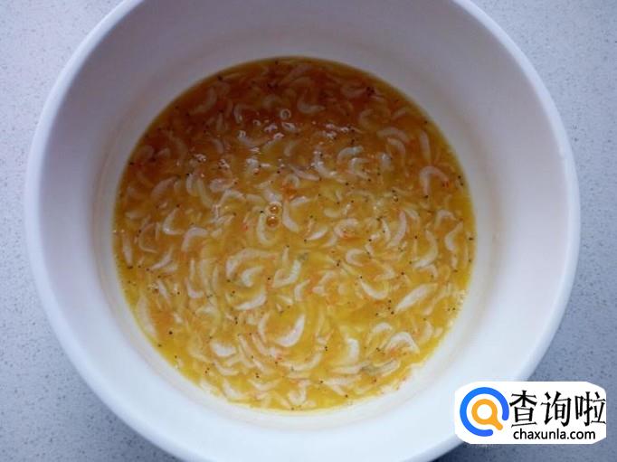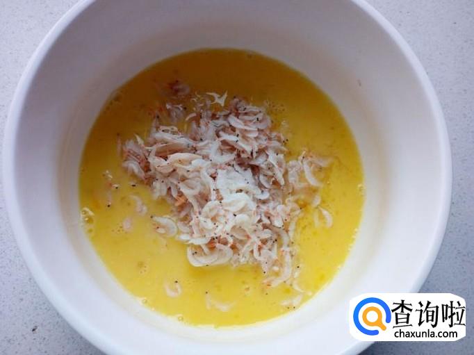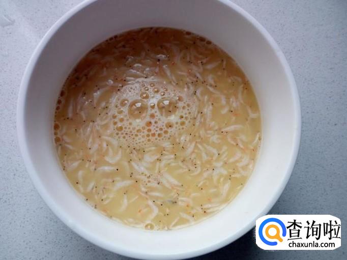 把控干水的虾皮放入鸡蛋液中,放入少量盐,味精(如果不是脱盐的虾皮,慎重放盐),搅拌均匀。