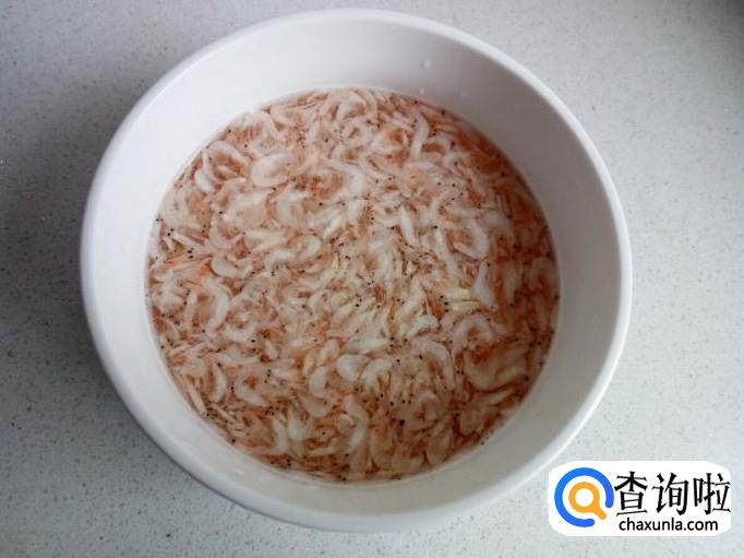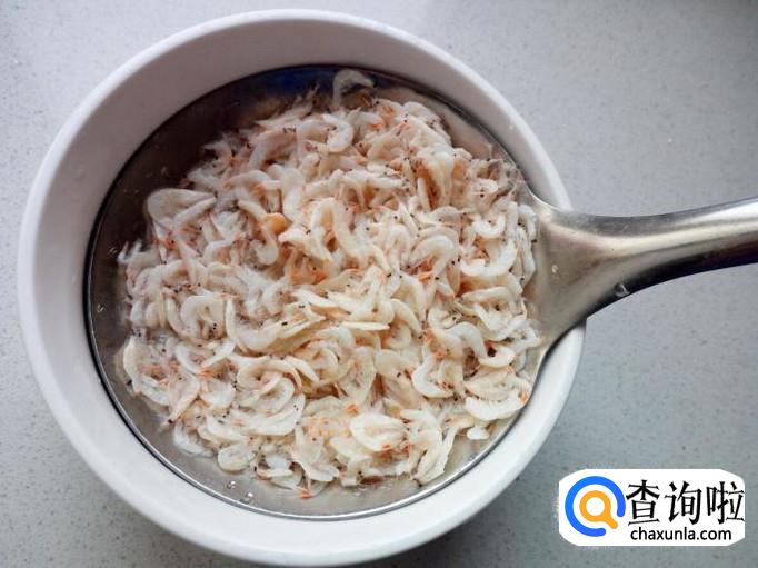 虾皮放入水中浸泡一下(变软),然后用水冲洗干净,控干水分。