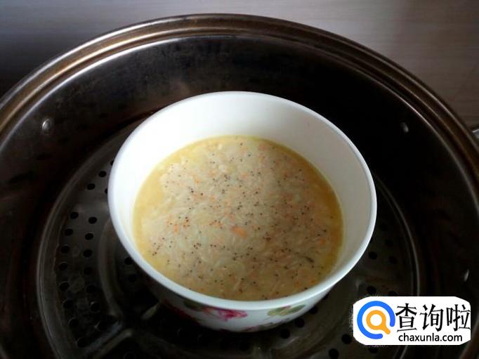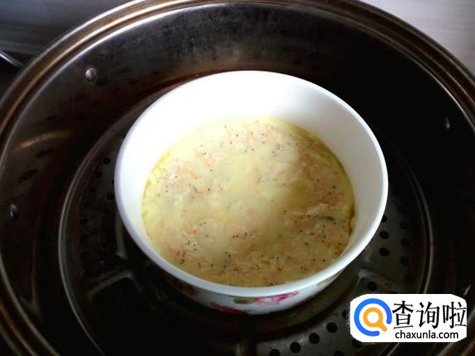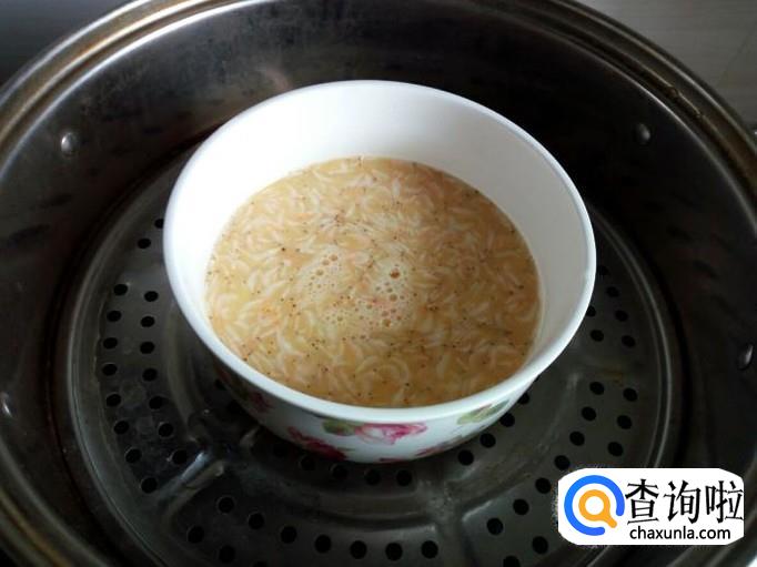 把虾皮鸡蛋液放入锅中蒸(冷水时候放入,水开时候再放均可)。