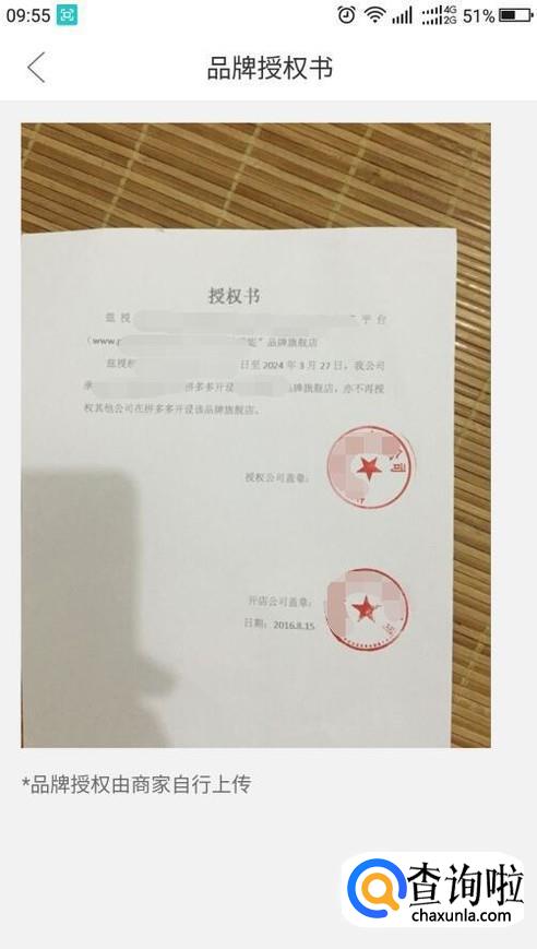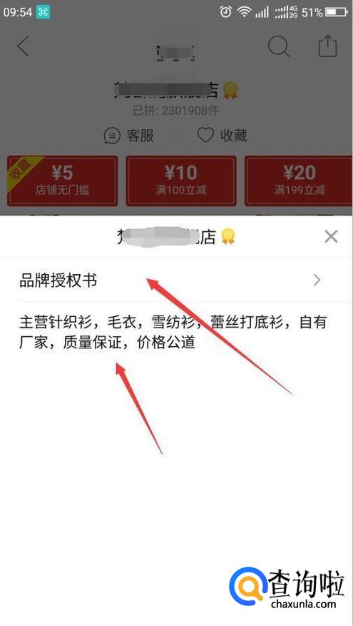 底部就会弹出商家信息,显示了商家的简介,点击品牌授权书,就可以查看品牌授权资质。