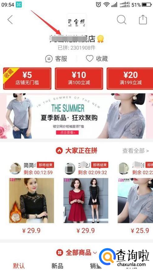 进入该商家的店铺后就能看到所有的商品,商家的店名在最上方,点击该店名。