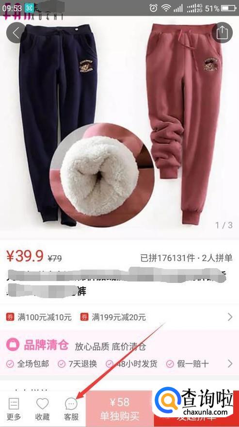 找到喜欢的商品后点击该商品进入,然后再点击左下角的客服。