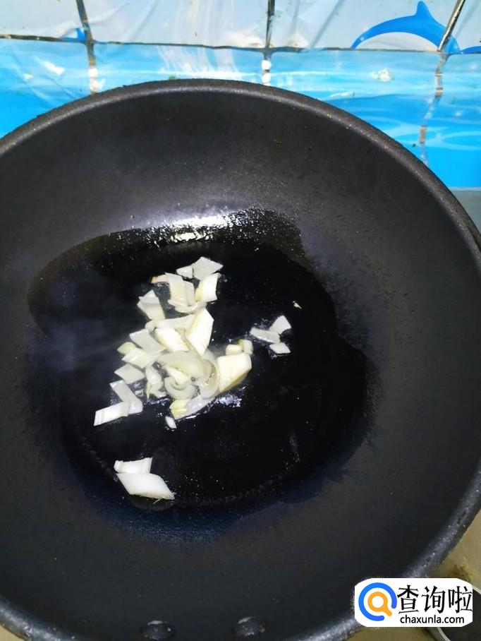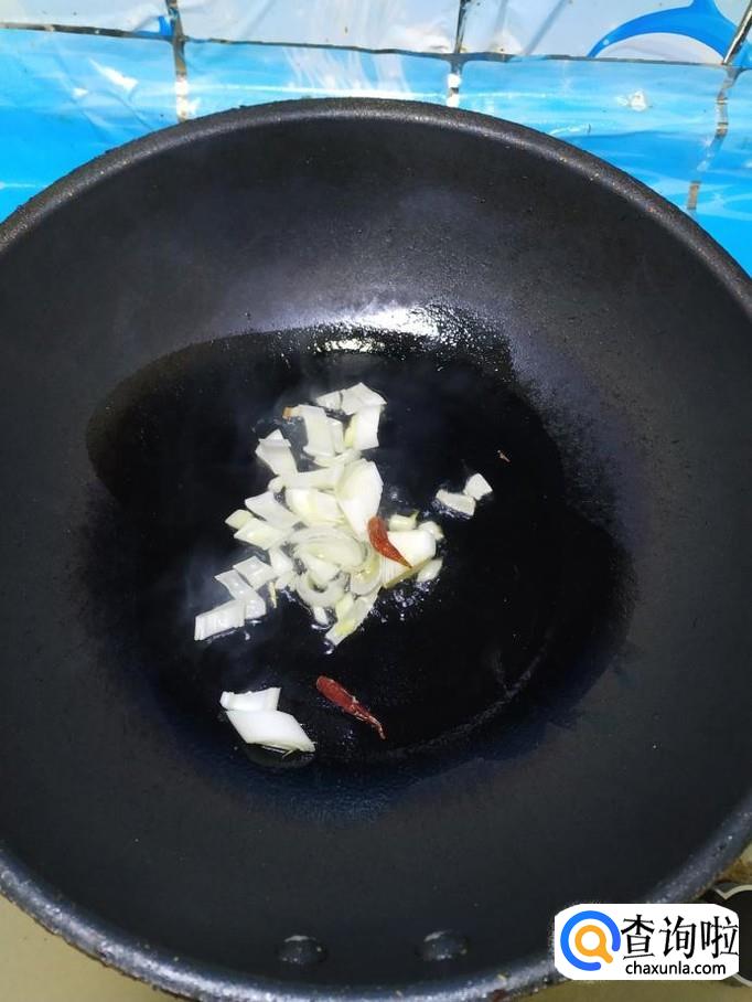 准备适量大葱,洗净后切碎,然后再准备适量辣椒,炒锅中放入适量油,油热后将大葱和干辣椒放入锅中炒香。
