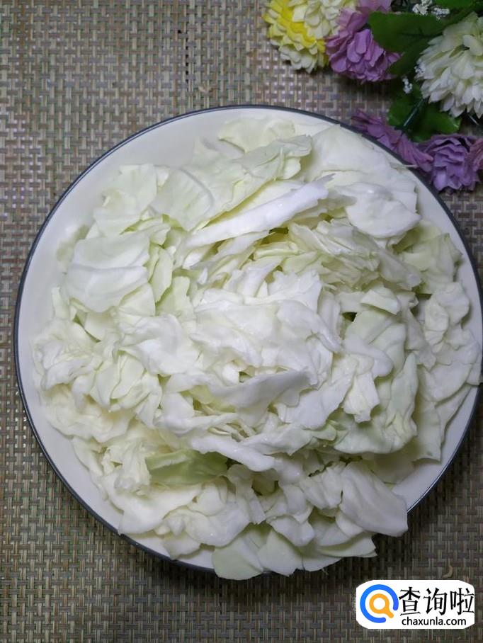 准备适量包菜,用手撕成片,用清水洗净,沥干水分,放入盘中备用。