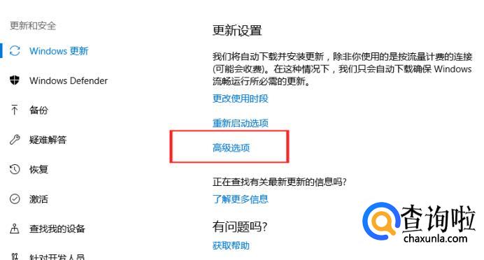 点击了“window更新”之后,会显示电脑Windows更新的状态的界面,点击下面的“高级选项”