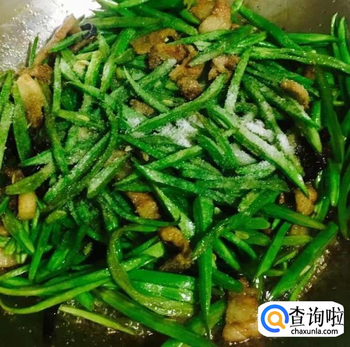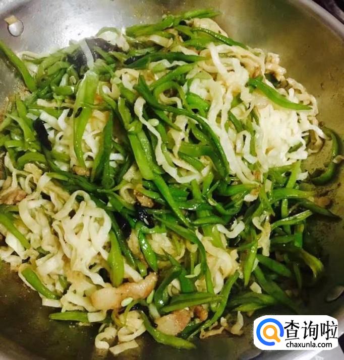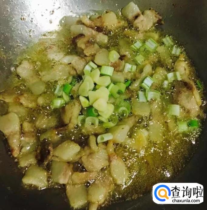 热锅加入多一点的花生油放入五花肉片炒至变色后加入葱花、蒜片爆香,烹入料酒、生抽,放入豆角丝翻炒均匀后加入适量的清水和盐调味