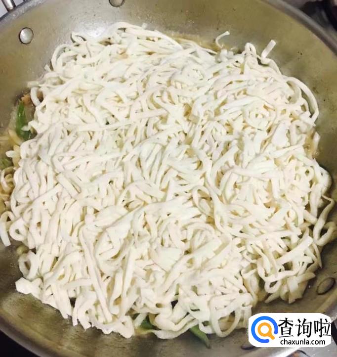 把面条铺撒在豆角上面盖好锅盖大火焖三分钟左右,当听到锅中嗞嗞响并㸆干水分的时候立即关火揭开锅盖用炒菜铲配合筷子把面条和菜快速搅拌均匀即可。
