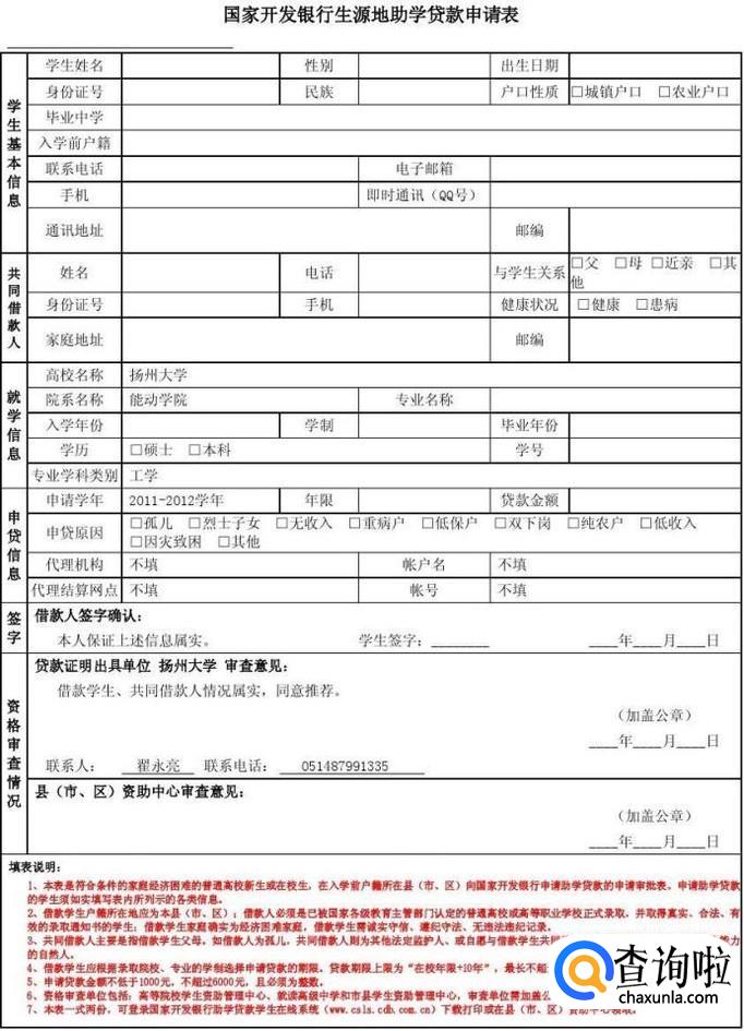 助学贷款可以在学校申请也可以到当地政府申请。首先需要《国家开发银行股份有限公司生源地信用助学贷款申请表》一份,这个是在办理现场审核后从学生在线服务系统中导出打印。将表上的信息填写完整