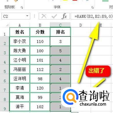 另外,在这里要注意的是,公式中=RANK(B2,B2:B9,0)的B2:B9是要绝对引用符号的。否则计算排名错误的。