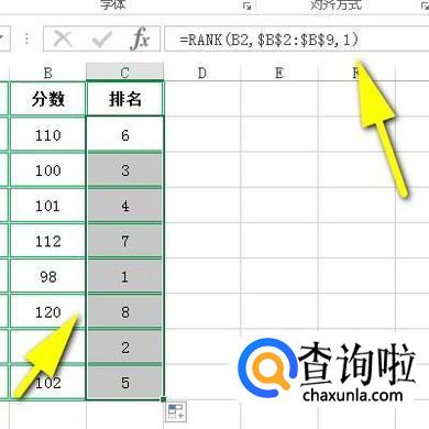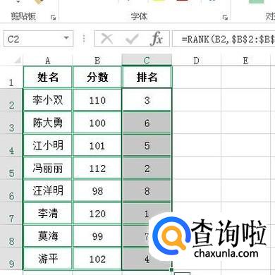 按下CTRL+回车,C2:C9自动得到相应的得数。那么,排名就出来了。