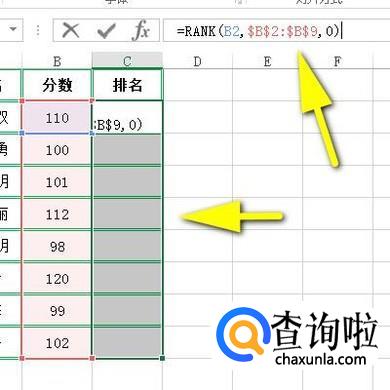 接着,在编辑栏输入公式:=RANK(B2,B2:B9,0)