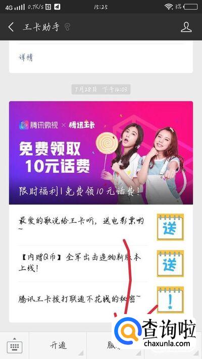 进入王卡助手公众号后,点击最下方的“服务”选项,如图1箭头所示。会出现一个新的界面,如图2所示。
