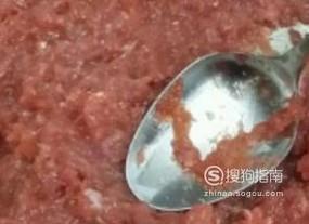 将剁好的肉馅加入糖、蜂蜜、胡椒粉用勺子往一个方向搅拌,直至搅拌上粘性。