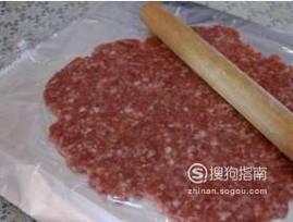 将肉馅放入塑料袋或者保鲜膜中,用擀面杖擀成一个薄肉饼。