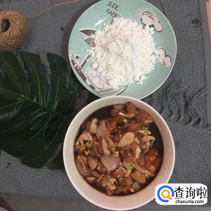 接着把鸡肉用适量的玉米淀粉裹一下,如下图所示。
