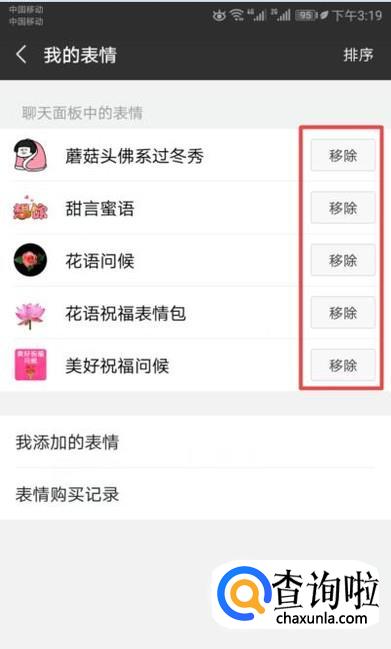 弹出的界面,我们就可以看到我们保存的表情包了,我们点击移除就可以删除我们保存的表情包了。