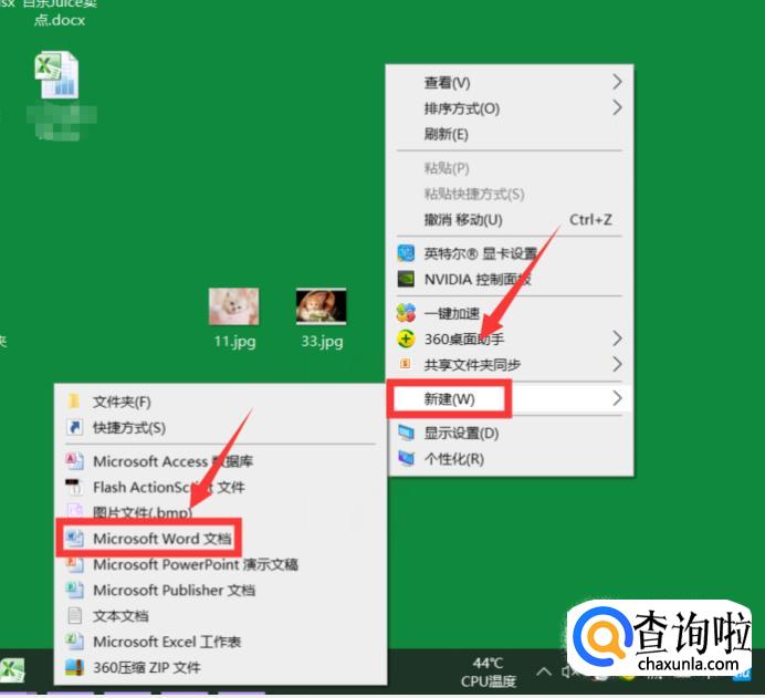 首先我们在电脑桌面的一个空白位置点击右键,然后将鼠标移至【新建】,之后再点击【Microsoft Word 文档】,如图一所示。