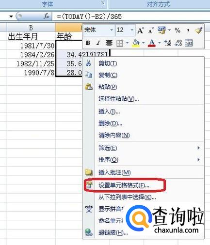 此时,我们发现年龄有小数形式,肯定是不对的,我们需要设置一下单元格格式,选中所有数据后,右键单击,选择“设置单元格格式”。