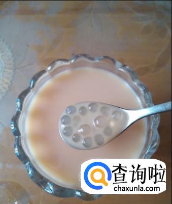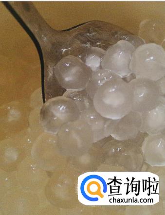 倒入少许西米在小锅内煮至西米内里泛有一小粒白点即可(煮制时需特别注意火候)。从锅里捞出后放在凉水碗里过渡。然后放在碗中备用。
