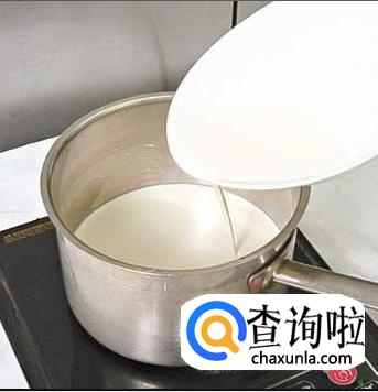 将牛奶倒入锅内,放入少许白糖(可根据自己口味定量放糖),加入适量炼乳,进行搅拌。
