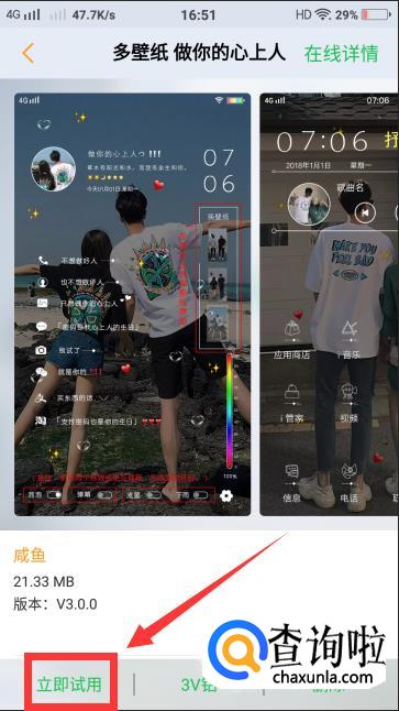 进入后,你可以左右划一下,看一下效果,也可以在该页面的左下角点击【试用】,然后点击【立即试用】,手机上面就会更换成新的壁纸,让你看看效果哦。