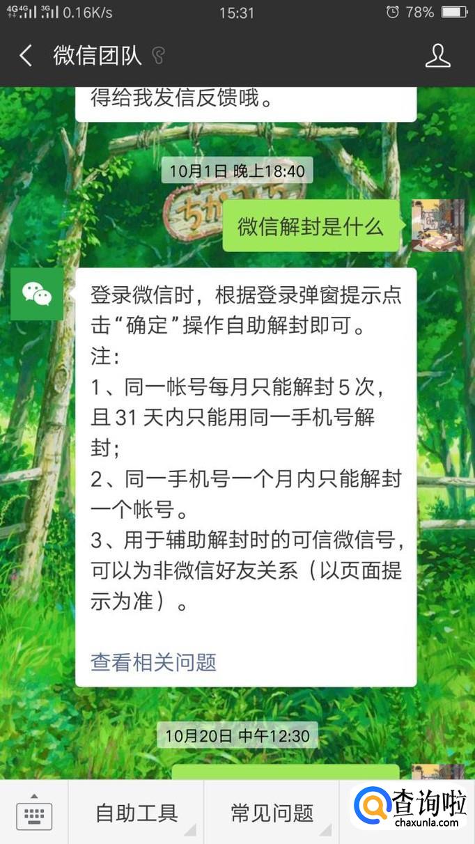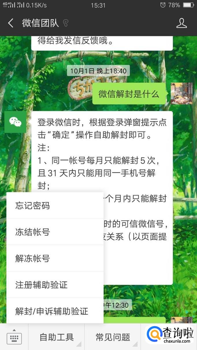 进入微信团队之后,可以先对“微信解封”进行一个简单的了解,了解之后才能更好的操作解封。微信解封分两种,解封自己的号和解封好友的号。点击左下角“自助工具”,就会进入下一操作界面啦。