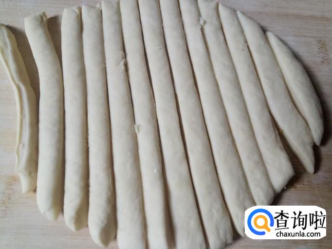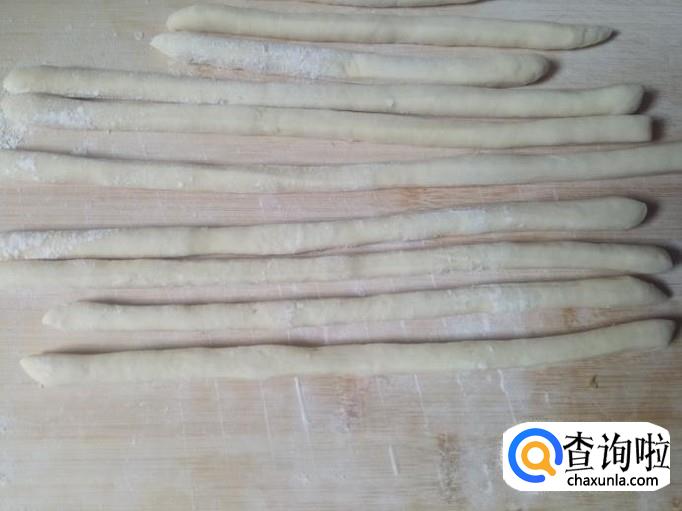 将切好的长条用双手进行揉搓,搓成圆的长条。