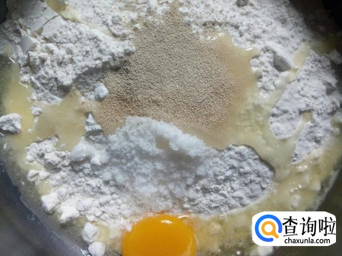 在面粉里放入鸡蛋、牛奶、白糖和酵母,用温水活面,然后密封发酵一个小时。
