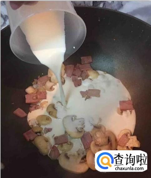 将培根切成小片状。在锅中放入黄油,等到黄油化开,放入切好的培根片稍微炒一下,再放入香菇片进行煸炒。超不多一分钟左右,加入淡奶油和牛奶,用铲子将其和匀。盖上锅盖,焖煮