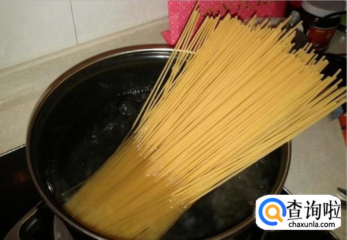 处理意大利面。吃过意大利面的人都知道它粗长,所以进行煮的时间也要比普通的面稍微长一些。在锅中加入水,煮沸,放入意大利面。将意大利面进行煮沸,当意大利面煮沸大概8分钟左右,关小火进行煮,大概十分钟。