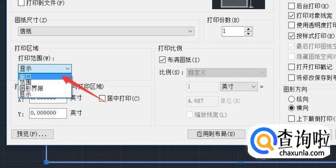 打开打印页面之后,在左边中间的位置有一个打印范围,点开打印范围下面的显示。