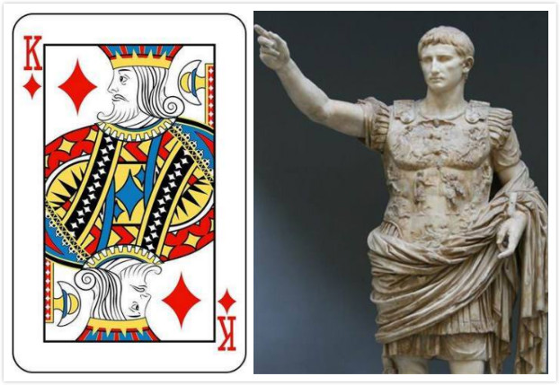 方块K:凯撒大帝,罗马共和国终生执政官,花八年时间征服了高卢全境,公元前49年,他率军占领罗马,打败庞培,集大权于一身,实行独裁统治。公元前44年,凯撒大帝被元老院成员暗杀身亡,他的外甥及养子屋大维打败安东尼开创了罗马帝国成为第一位帝国皇帝。扑克牌上凯撒头像后面的那把斧子代表着他是被暗杀的。