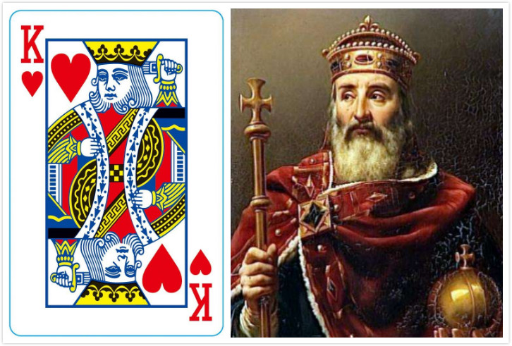 红桃K:查理曼大帝,他在位14年发动50多场战争,控制了大半个欧洲,因此也被尊称为“欧洲之父”。