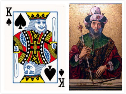 他善用竖琴演奏,并在圣经上 写了许多赞美诗,所以黑桃K画面上才会经常有竖琴图样。