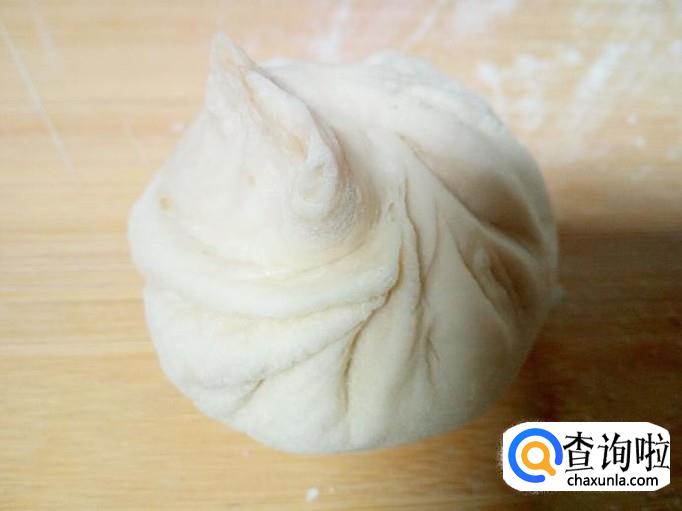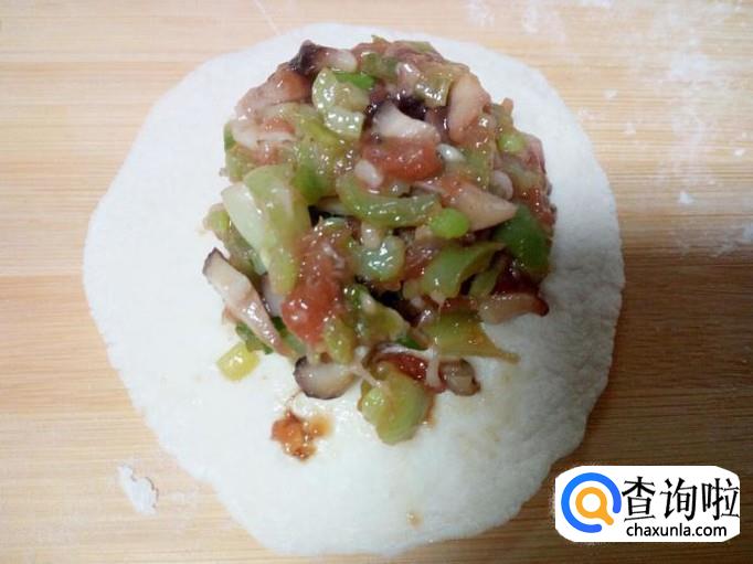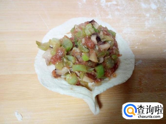 用匙儿把拌和好的包子馅,抟成团,放入面皮上,然后先用手捏住一个角,再按顺时针方向捏褶,捏成圆形后收口,形成包子形状。