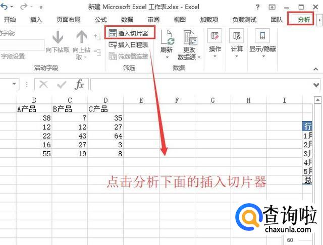 接下来我们点击顶部的分析菜单,然后选择下面的切片器选项,如下图所示