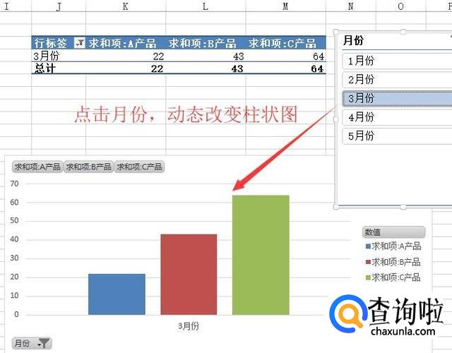 最后我们点击切片器中相应的月份就可以看到柱状图的数据发生改变了,如下图所示
